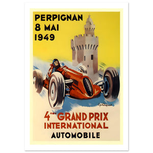 Sunlit French racing poster for the 4ème Grand Prix International Automobile at Perpignan, 8 May 1949, showing a scarlet single-seater drifting past the city’s medieval tower, wheels spinning furiously, driver in blue overalls braced against speed, celebrating postwar competition, Mediterranean glamour and racing heritage.