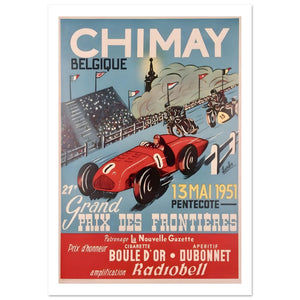 Colorful Belgian poster for the 21st Grand Prix des Frontières at Chimay on 13 May 1951, featuring a red number one race car leading motorcycles past crowded grandstands, waving flags and church spire, celebrating Pentecost weekend speed, sponsors Boule d’Or, Dubonnet and Radiobell, motorsport glamour.