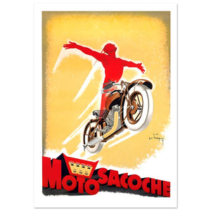 This striking Art Deco poster celebrates the Swiss motorcycle brand Motosacoche with a bold, minimalist design. The composition is dominated by a vibrant red silhouette of a rider with arms triumphantly outstretched, conveying a sense of pure exhilaration and freedom.