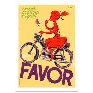 This charming vintage poster by artist Bellenger captures the essence of French mid-century style. Featuring a chic red silhouette of a woman effortlessly applying lipstick while riding a Favor moped, the design perfectly embodies its slogan: simple, pratique, élégant. With its vibrant yellow background and bold purple typography, this retro advertising art exudes playfulness and sophistication. It is an ideal piece for collectors of European industrial design, vintage scooters, and classic mid-century modern home decor.