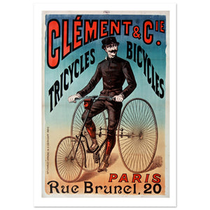 This vibrant vintage poster for Clément & Cie promotes their tricycles and bicycles with striking visual appeal. The central figure, a well-dressed man in a formal black outfit and top hat, rides a large high-wheel bicycle, exuding confidence and sophistication. The bold Clément & Cie logo at the top, with the Paris Rue Brunel address, emphasizes the brand's prestigious Parisian roots. The soft gradient background, transitioning from blue to orange, adds warmth to the design, while the prominent, large wheels of the bicycle symbolize innovation and quality. This poster conveys the luxury and advanced engineering of Clément cycles.