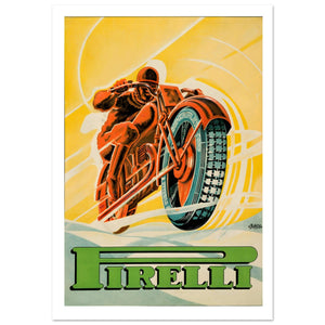 This vibrant poster for Pirelli showcases a motorcycle rider in full motion, leaning into a sharp turn, with a close-up of the powerful tire gripping the road. The bold red and orange hues of the bike contrast against the bright yellow background, creating a sense of speed and excitement. The tire, marked "SUPERFLAT," prominently displays the Pirelli logo, highlighting the brand's dedication to performance and quality. The text "Pirelli" at the bottom in bold green adds to the vintage appeal. This design captures the thrill of motorcycling, emphasizing Pirelli's expertise in high-performance tires.