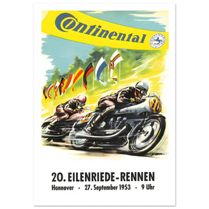 Celebrate the golden era of German motorsport with this vibrant vintage racing poster for the 20. Eilenriede-Rennen. Held in Hannover on 27. September 1953, this historic event is captured through dynamic artwork of racers leaning into a high-speed curve. Featuring prominent Continental tire branding and a colorful array of international flags, the design exudes mid-century speed and prestige. This nostalgic collectible is a must-have for enthusiasts of classic motorcycles and historic European grand prix racing culture.