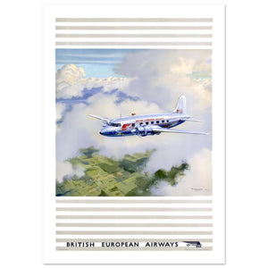 This elegant vintage travel poster for British European Airways (BEA) features a majestic silver propeller plane soaring through a sea of soft, white clouds. Below the aircraft, a lush green landscape of patchwork fields is visible through clearings in the mist, evoking a sense of peaceful exploration. The central illustration is framed by clean, horizontal grey stripes at the top and bottom, lending the design a sophisticated, modern feel. Minimalist typography and the classic BEA logo anchor the bottom of the poster, perfectly capturing the quiet grace and luxury of mid-century European aviation.