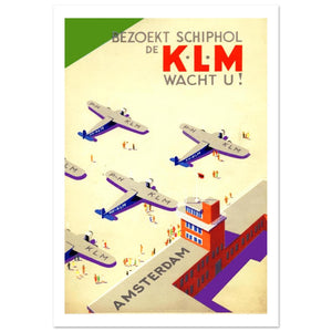 This elegant vintage travel poster promotes KLM flights to Schiphol Airport in Amsterdam. The illustration features a bird's-eye view of a sun-drenched airfield where several sleek, blue and silver propeller planes are stationed. Miniature figures of passengers and crew walk across the tarmac, highlighting the organized activity of early commercial aviation. A prominent red-brick terminal building with a distinct control tower anchors the foreground, clearly marked with the city's name. With its clean lines and bold Dutch typography, the artwork perfectly captures the sophisticated charm of mid-century air travel.