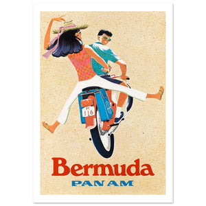 This playful vintage travel poster from Pan Am captures the youthful energy of a tropical getaway to Bermuda. The minimalist design features a stylish couple riding a white scooter, with the woman sitting on the back, legs joyfully outstretched as she holds her sun hat. The scooter is equipped with a classic blue Pan Am saddlebag, linking the airline's brand to local island exploration. Against a warm, sandy-textured background, the bold red typography of "Bermuda" creates a striking focal point, evoking the sun-drenched freedom and adventurous spirit of a mid-century vacation.
