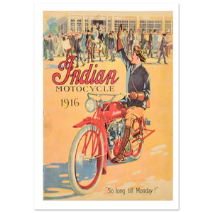 This 1916 advertisement for Indian Motocycle captures the celebratory spirit of the early 20th-century weekend. The illustration features a young man in tall leather boots and a cap riding a vibrant red motorcycle away from a large group of people. He raises an arm in a cheery wave, paired with the nostalgic slogan, "So long till Monday!". The scene, set against a warm yellow backdrop and a large industrial or school building, emphasizes the motorcycle as a tool for personal liberty and escape. It remains an iconic representation of the Hendee Mfg. Co. era.
