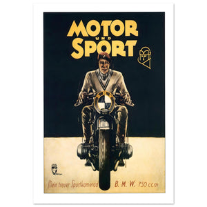This iconic 1930s poster features a BMW motorcycle with the striking headline "Motor und Sport," capturing the essence of both the vehicle's performance and its connection to sporting excellence. The design shows a confident rider on a BMW 750cc motorcycle, with a spotlight on the illuminated BMW logo on the front. The dark background contrasts with the warm gold and beige tones of the text and the motorcycle, enhancing the visual impact. The tagline "Mein treuer Sportkamerad" (My Loyal Sports Companion) emphasizes the reliability and elegance of the BMW motorcycle, appealing to enthusiasts of the time.
