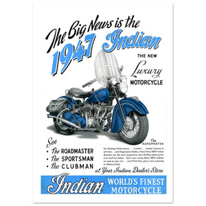 This 1947 advertisement for Indian marks a transition into post-war industrial design, shifting from the painterly styles of earlier decades to a crisp, graphic layout. The poster features the "New Luxury Motorcycle," specifically highlighting the Roadmaster model in a striking blue and chrome finish. Promising "flashing performance" and "engineered safety," the text invites riders to view the Roadmaster, Sportsman, and Clubman models at their local dealer. With its clean white background and bold blue accents, the advertisement frames Indian as the producer of the "World's Finest Motorcycle".