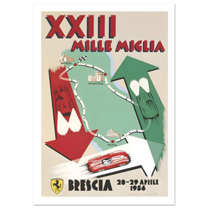 Stylized poster for the XXIII Mille Miglia 1956, depicting Italy as a racing route from Brescia through Mantova to Rome and back. Bold red and green arrows carry speeding sports cars, while a Ferrari roadster blasts past Brescia text, celebrating endurance, speed and motor-racing romance.