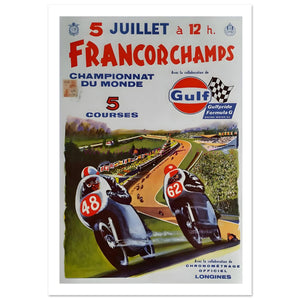 This vibrant vintage poster promotes the 5th July 1959 Francorchamps World Championship race. Featuring a stunning illustration, it highlights two motorcyclists in dynamic motion, racing through the winding track at the iconic Circuit de Spa-Francorchamps. The bold numbers "48" and "62" identify the competitors, emphasizing the action-packed race. Gulf, a key sponsor, is prominently displayed, showcasing their involvement with Gulfpride Formula G motor oil. The poster’s design, with its colorful depiction of the racing scene, conveys excitement and energy, while the French text provides essential details about the event’s time and location, making it a collector’s gem.