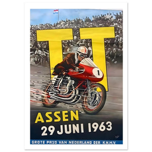 This vibrant 1963 poster promotes the Grote Prijs van Nederland, held on June 29, 1963, at the legendary Assen circuit. Dominated by bold yellow "TT" initials, the poster showcases a dynamic action shot of a racer in a red outfit on a motorcycle, number 1, speeding around the track. The crowd’s excitement is evident in the background as they cheer on the racers. The design is energetic, with motion lines highlighting the racer’s speed. The event's date and location, Assen, are prominently displayed, while the "Grote Prijs van Nederland" text emphasizes the prestigious nature of the race.