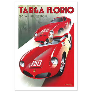 Stylish Italian racing poster for the 1964 Targa Florio, featuring two scarlet Ferrari sports cars numbered 150 and 128 carving through the Sicilian mountains. Sleek curves, cool forest backdrop and bold typography evoke speed, glamour and the legendary endurance road race’s golden era in motorsport.