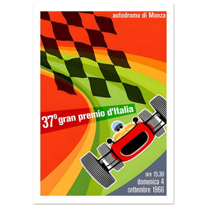 Playful 1966 Italian Grand Prix poster for the 37th Gran Premio d’Italia at Monza, featuring a cartoon-red Formula car charging along sweeping green and orange bands toward a bold chequered flag against a vibrant sunset background, capturing the colourful energy of 1960s Monza race day.