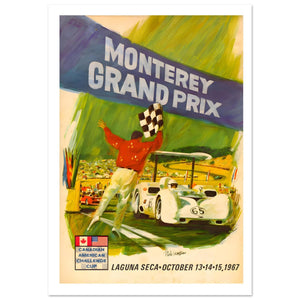 Vibrant 1967 Monterey Grand Prix poster for the Can-Am series at Laguna Seca, showing a white sports prototype number 65 flashing past the chequered flag. Sweeping green hills, colourful crowd and bold banner overhead capture Californian sunshine, speed, and the drama of international sports-car racing.
