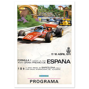 Colourful Spanish Grand Prix poster for the seventeenth Gran Premio de España at Barcelona, 17–18 April 1971, showing a scarlet number sixteen car leading yellow and blue rivals past grandstands and arches, advertising the official race programme and supporting Barcelona and international motor show trophies.