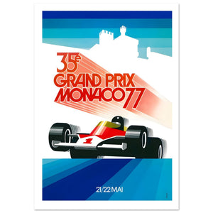Bold, graphic poster for the 35th Monaco Grand Prix 1977, featuring a low-slung Formula One car with number 1 blasting forward beneath radiant red speed rays, silhouetted Monte Carlo skyline and layered blue bands suggesting sea, sky and the glamour of the classic street circuit.