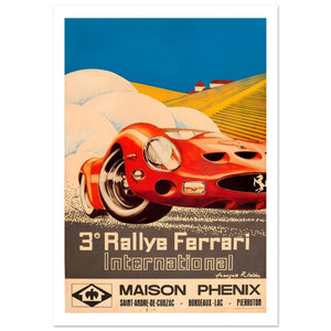 Striking French poster for the 3e Rallye Ferrari International, showing a scarlet Ferrari sports car power-sliding in front of golden vineyard hills and bright blue sky, dust clouds billowing behind, promoting Maison Phenix dealerships at Saint-André-de-Cubzac, Bordeaux-Lac and Pierroton across southwest France with bold lettering.