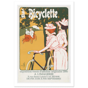 This vintage poster from 1900 invites viewers to an exhibition showcasing original bicycle-themed posters at L’Imagerie in Paris. The artwork features two fashionable women dressed in elegant white attire, with one of them leaning on a bicycle while admiring a passing motor vehicle. The vibrant color palette, featuring a warm yellow and green background, reflects the dynamic spirit of the early 20th century, capturing the rising interest in bicycles as both a mode of transport and leisure activity. The poster highlights the juxtaposition of old and new, with the bicycle contrasting against the emerging automobile.