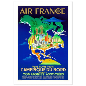 This vibrant 1951 Air France poster, illustrated by artist Plaquet, promotes travel across North America through its network of associated airlines. The central feature is a 3D-effect map of the continent, filled with iconic imagery including the Statue of Liberty, sprawling city skylines, towering redwood forests, and industrial centers. Multiple white aircraft silhouettes buzz around the landmass, while a larger silver propeller plane soars across the deep blue background. Below the map, a comprehensive list of partner carriers—such as Delta, American, and National Airlines—highlights the extensive connectivity offered to international travelers.