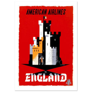 This striking vintage travel poster for American Airlines promotes travel to England through a bold, graphic illustration of a medieval castle. Created by renowned artist E. McKnight Kauffer, the design features a highly stylized, multi-towered fortress rendered in a high-contrast palette of black, white, and orange. The castle is set against a vibrant, saturated red background, creating a powerful visual impact. With its clean, modernist lines and dramatic block typography, the artwork evokes a sense of historical grandeur and timeless mystery, inviting travelers to explore the architectural heritage and legendary landscapes of the United Kingdom.