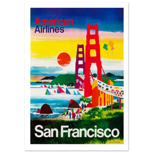 This colorful American Airlines "San Francisco" Vintage Poster captures the iconic Golden Gate Bridge against a vibrant sunset backdrop, with sailboats on the water and people enjoying the scenic coastline. The dynamic, bold colors and joyful atmosphere evoke the allure and charm of San Francisco, making it an inviting destination for travelers. With its retro style, this poster perfectly showcases the spirit of 1960s American travel, offering a beautiful piece for collectors of vintage airline and travel art.