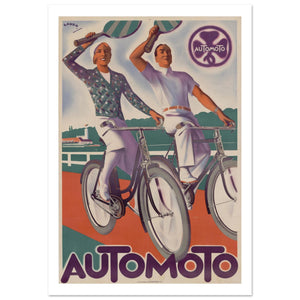 This striking Art Deco advertisement for the French manufacturer Automoto captures the elegant spirit of 1930s leisure. Created by the renowned artist Maurice Lauro, the poster features a stylish man and woman cycling toward the viewer with effortless grace. Both figures hold tennis rackets aloft, cleverly blending two popular sporting pastimes to promote a healthy, high-society lifestyle. The dynamic composition utilizes strong perspectives and a bold color palette of deep purple, teal, and vibrant orange. With its streamlined forms and iconic clover logo, the artwork portrays the bicycle as a definitive symbol of modern sophistication and joyful athleticism.