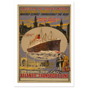 This vintage travel poster promotes Atlantic Transport Line's round trip service between London, Boulogne, and New York aboard the S.S. Minnekahda. Offering an exclusively tourist third class experience, the poster emphasizes the opportunity for a long vacation in America, with a round trip price of £40. The ship is depicted sailing through the waters, with the iconic New York skyline in the background. At the foreground, two men exchange pleasantries, symbolizing the excitement of travel and exploration across the Atlantic.