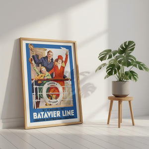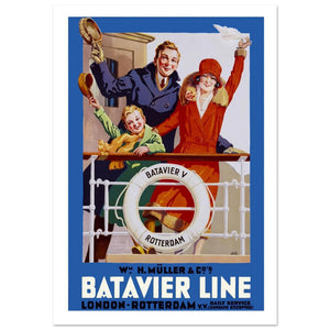 This cheerful vintage travel poster promotes the Batavier Line, showcasing the Batavier V ship traveling between London and Rotterdam. The vibrant image features a happy family of three waving from the ship's deck, adding a sense of warmth and excitement to the journey. The bold colors of the background and the iconic Batavier life ring evoke a sense of joy and adventure, making it an inviting advertisement for travelers seeking a daily service (except Sundays) between these two cities. The style reflects the glamour and optimism of early 20th-century maritime travel.
