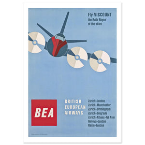 Celebrate the luxury of early jet travel with this striking vintage poster for British European Airways (BEA) promoting the Vickers Viscount, proudly nicknamed "The Rolls Royce of the skies." The clean, mid-century graphic features a dynamically rendered, four-engine Viscount prop-jet soaring across a cool blue sky, symbolizing speed and modernity. Against a bold, red BEA logo, the poster lists key European routes, including Zurich to London, Manchester, and Tel Aviv. This elegant piece of advertising art perfectly encapsulates the sophisticated, minimal design of the 1950s and 60s, making it an essential acquisition for aviation history buffs and fans of classic European airline glamour.