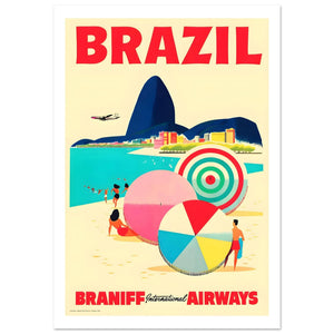 This vibrant vintage poster from Braniff International Airways promotes travel to Brazil, capturing the sunny, laid-back allure of Rio de Janeiro. The illustration features a beach scene with large, colorful beach balls, set against the stunning backdrop of Rio’s coastline, including the famous Sugarloaf Mountain. A plane flies overhead, highlighting the ease of reaching this tropical paradise with Braniff. The bold "BRAZIL" text at the top and the "BRANIFF International AIRWAYS" logo at the bottom emphasize the airline's role in connecting travelers to this exciting and vibrant destination, making it a perfect summer getaway.
