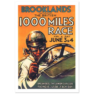 Dynamic vintage poster for the British 1000 Miles Race at Brooklands, featuring a determined helmeted driver gripping the wheel against a glowing orange background, promoting the June 3–4 endurance event.