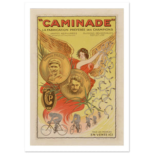 This vibrant vintage French poster promotes Caminade bicycles as the "preferred choice of champions". The artwork features a winged goddess in red robes crowning the brand’s success. Two gold medallions showcase portraits of legendary cyclists François Faber and Emile Friol. Below, a line of racers speeds across the frame, while a cascade of "reversible handlebars" flows from the goddess's hand, emphasizing technical innovation. The poster highlights high-quality components like "ribbed rims" and "gold reflection" finishes, blending athletic prestige with the elegant Art Nouveau aesthetic of the early 20th century.