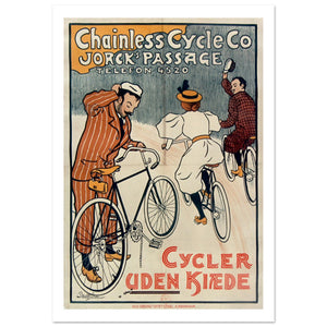 This vibrant vintage advertisement promotes Chainless Cycle Co., a revolutionary bike brand featured in the Jørck Passage of Copenhagen. The poster portrays a charming scene with three cyclists, dressed in fashionable outfits, riding effortlessly without chains, a nod to the innovative design. The cyclists’ cheerful demeanor, with one tipping his hat and another in a wave, reflects the convenience and freedom the product offers. The Danish text "Cycler Uden Kædede" translates to "Bikes Without Chains," emphasizing the core selling point. The colorful background and art nouveau styling evoke a sense of fun and modernity, capturing the spirit of the era.