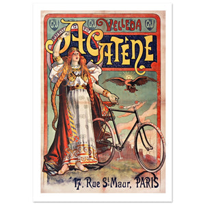 This exquisite Art Nouveau poster for Acatène Velleda features the Germanic prophetess Velleda, portrayed as a majestic figure with flowing red hair and ornate, patterned robes. She stands regally beside a chainless bicycle, which was a significant technological innovation of the late 19th century. The composition is rich with mythological symbolism, including a golden halo and a soaring bird of prey, effectively imbuing the machine with a sense of divine power and grace. Elaborate decorative borders and stylized typography in vibrant red and gold frame the scene, perfectly blending industrial advertisement with timeless Belle Époque artistry.