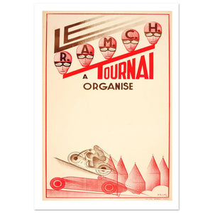 This vintage racing poster promotes the "Le RAMCH A Tournaï Organise" event, showcasing an elegant, early 20th-century design. The artwork features stylized helmets of racers in red and brown hues, evoking the era's sleek, aerodynamic designs. The poster emphasizes motion with bold, dynamic lines above the helmets, leading the viewer’s eye toward the action below. A motorcycle and a race car are depicted at the bottom, conveying the event's multi-disciplinary nature. The minimalist design, paired with the striking use of red tones, highlights the prestige and excitement of the racing tournament, making it an iconic piece of racing history.