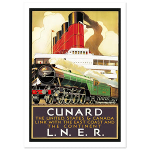 This vintage poster from Cunard promotes the transatlantic journey linking the United States and Canada with the East Coast and the Continent. It features a powerful depiction of both a luxurious Cunard ocean liner and a classic green steam locomotive. The vibrant artwork emphasizes the seamless connection between rail and sea travel, highlighting the convenience and speed of the Cunard and L.N.E.R. service. The bold, stylish design captures the spirit of early 20th-century travel, combining elegance and innovation.