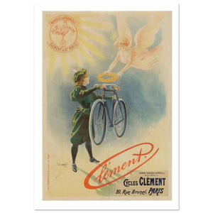 This vintage Cycles Clément poster features a captivating image where an angel, bathed in divine light, gracefully hands a wreath to a woman holding a bicycle. The angel symbolizes excellence and triumph, as the woman represents the joy and freedom that comes with cycling. The soft pastel hues and ethereal design emphasize the sense of dreamlike achievement, with the bicycle acting as the central symbol of this blissful moment. The Clement brand is prominently displayed, celebrating the company’s legacy in bicycle manufacturing in Paris, at 20 Rue Brunel. The artistic style reflects the romanticized, idealized vision of cycling during this period.
