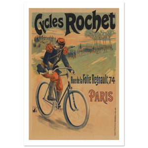 This striking vintage French poster advertises Cycles Rochet, emphasizing the brand's utility and speed within a military context. The central figure is a French soldier in full uniform, complete with red epaulettes and a rifle slung across his back, pedaling a bicycle with focused intensity. In the background, a cavalry troop and infantrymen march across a field, suggesting the bicycle's role in modernizing army mobility. The bold, stylized typography lists the company's Parisian address at 74 Rue de la Folie Regnault. The earthy color palette and dynamic composition highlight the rugged reliability of the Rochet brand.