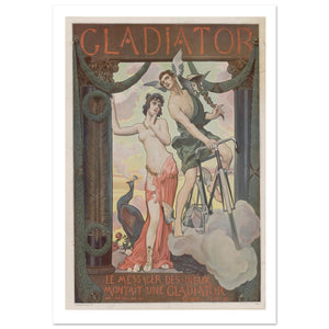 This elegant vintage poster promotes the Gladiator Bicycle, using mythology and art to emphasize the bike's power and grandeur. The imagery features a muscular, heroic figure, representing the messenger of the gods from Greek mythology, riding the Gladiator bicycle, which symbolizes strength and endurance. The figure’s presence is complemented by a seductive figure beside him, adding a mythical aura to the advertisement. The tagline in French reads, “The messenger of the gods rode a Gladiator,” drawing from Ovid's writings. The design's vibrant colors and classical motifs suggest that this bicycle is both powerful and prestigious, appealing to elite cyclists.