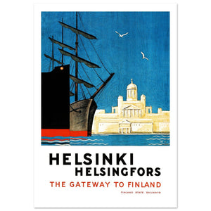 This charming Helsinki "The Gateway to Finland" Vintage Poster showcases the scenic beauty and rich history of Finland’s capital. The artwork features a majestic sailing ship set against the striking backdrop of Helsinki’s iconic architecture, with a bright blue sky and peaceful waters. The bold typography and minimalist design evoke the elegance of travel to Finland, emphasizing Helsinki as the key point of entry. A perfect addition for lovers of Scandinavian travel and vintage poster collectors, this piece captures the timeless allure of Finland’s capital city.