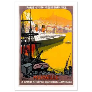 This vibrant Marseille "La Grande Métropole Industrielle & Commerciale" Vintage Poster captures the bustling port city of Marseille in the 1930s. Featuring a majestic ocean liner arriving at the harbor with cargo ships in the foreground, the poster highlights Marseille's status as a vital industrial and commercial hub. The warm yellow backdrop and dynamic composition make this piece a striking representation of France's Mediterranean gateway. Perfect for lovers of travel and maritime history, this poster embodies the energy and elegance of early 20th-century French ports.