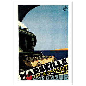 This vibrant Marseille "Point de Départ de la Côte d'Azur" Vintage Poster highlights the beauty and elegance of the Mediterranean region, featuring a stylized view of the city’s port. With a sleek ship in the foreground and a luxury car heading towards the coast, the design emphasizes Marseille as the gateway to the stunning Côte d'Azur. The bold typography and dynamic composition capture the allure of this iconic French destination, making it a perfect piece for collectors of vintage travel and maritime art.