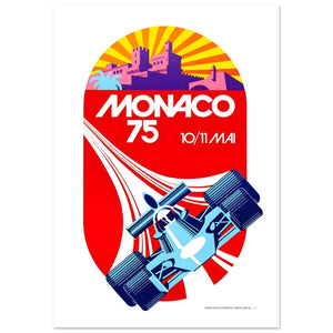 Vibrant 1975 Monaco Grand Prix poster featuring a stylized blue Formula One car slingshotting through sweeping white racing lines against bold red. Above, the sun rises over Monaco’s pink palace silhouette and palm trees, capturing Mediterranean glamour, speed and spectacle on the legendary street circuit.