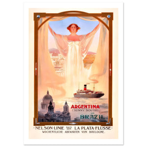 This striking vintage poster promotes luxurious travel to Argentina and Brazil, highlighting the weekly departures from Boulogne. The artwork features a graceful figure representing the allure of the sunny South, with a backdrop of iconic architecture and a ship sailing toward the horizon. The illustration's vibrant colors and Art Deco style convey an enticing vision of South American exploration via the Nelson Linie's prestigious La Plata River route.