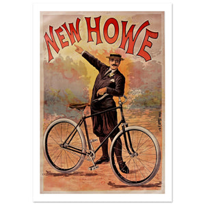 This vintage poster showcases the New Howe Bicycle, designed for the discerning rider. The poster features a sharply dressed man in a suit, complete with a bowler hat and mustache, confidently posing next to his bike. His outstretched arm and friendly gesture convey a sense of pride in the New Howe brand. The striking red typography of "NEW HOWE" catches the eye, while the bike’s clean and classic design emphasizes the era's sophistication. The earthy background tones add to the vintage feel, positioning the New Howe Bicycle as a symbol of refinement and quality during its time.