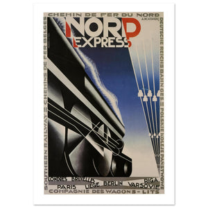This striking Nord Express Vintage Travel Poster showcases the elegance and speed of the renowned Nord Express train. Featuring a dynamic, futuristic design, the poster highlights the train’s journey through major European cities such as Paris, Berlin, and Brussels. The bold typography and streamlined imagery of the train cutting through the landscape evoke the excitement of early 20th-century rail travel, making this a perfect piece for collectors of vintage transportation art.