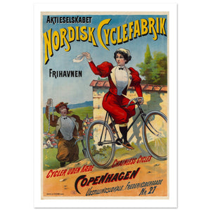 This vibrant Danish poster from Aktieselskabet Nordisk Cyclefabrik features a woman proudly riding a chainless bicycle while holding a handkerchief in the air. The background showcases a quaint village and rolling hills, emphasizing the freedom and ease of cycling. The bold yellow and red typography spells out the company name, with the tagline "Cycler uden Kæde" (Cycling Without a Chain), highlighting the key feature of the bike. The poster promotes Nordisk Cyclefabrik located in Copenhagen at Frederiksbergsgade Nr. 27. The scene is dynamic and full of energy, inviting viewers to embrace this innovative cycling experience.