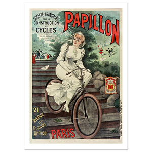 This vibrant vintage poster for Papillon Cycles portrays a sense of grace and elegance, with a fashionable woman in a flowing white dress riding a Papillon bicycle. She effortlessly navigates a set of stone steps, embodying both the beauty and practicality of the brand. The background features a lush, scenic view with playful figures and butterflies, symbolizing freedom and lightness. The bold "Papillon" brand name and the address 21 Avenue de la Grande Armée, Paris reinforce its prestigious Parisian roots. The soft color palette and intricate details suggest a refined lifestyle, inviting riders to embrace both style and performance.