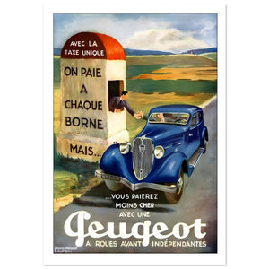 Charming vintage Peugeot advertisement showing a blue saloon stopping at a roadside tax booth as the driver pays per milestone. Rolling French countryside stretches behind, while playful text promises you’ll “pay less with a Peugeot” thanks to its economical performance and advanced independent front-wheel suspension.